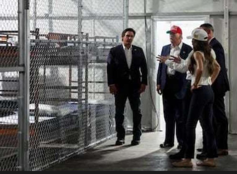 Donald Trump visitó el nuevo centro de detención para migrantes conocido como Alligator Alcatraz, en los Everglades de Florida. Rodeado de caimanes y levantado en menos de dos semanas, el sitio tiene capacidad para 5,000 camas y fue elogiado por el presidente como un “modelo nacional”. Durante su visita bromeó con la prensa sobre cómo escapar de un caimán: “Corran en zigzag. Sus probabilidades aumentan un 1%”.